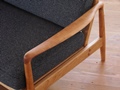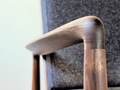 厚い無垢材を削り出して作ったアームが特徴のソファです。